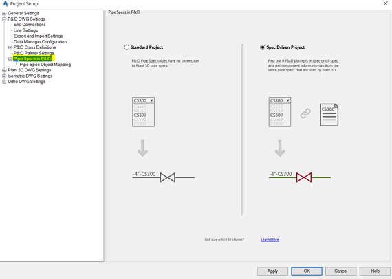 Při povolení řízení potrubních tříd v PID z Plant 3D (volba Spec Driven Project v Project Setup > PID DWG Setting > Pipe Spec in PID) dojde k vyhledávání parametrů potrubních dílů z potrubní třídy aktuálně vybrané v Plant 3D.