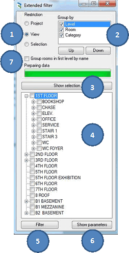 The function Extended filter offers - compared to the default Revit filtering - a more detailed selection of drawing elements. It allows to limit the selection to a project, to the current view or to a selection set. You can group selected components by level, room or category in any order. You can also filter by parameters contained in families.