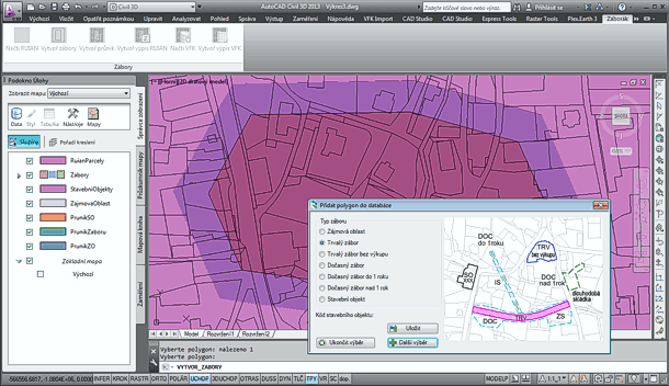 Nová nadstavbová aplikace CAD Studia - "Záborák" - je určena pro projektanty inženýrských staveb - přináší pohodlí, rychlost a přesnost vytváření záborových elaborátů přímo z projekčních podkladů v AutoCADu Map nebo Civil 3D a dat katastru nemovitostí. Zpracovává online katastrální data RÚIAN i data formátu VFK - nyní přímo v prostředí projekční aplikace.